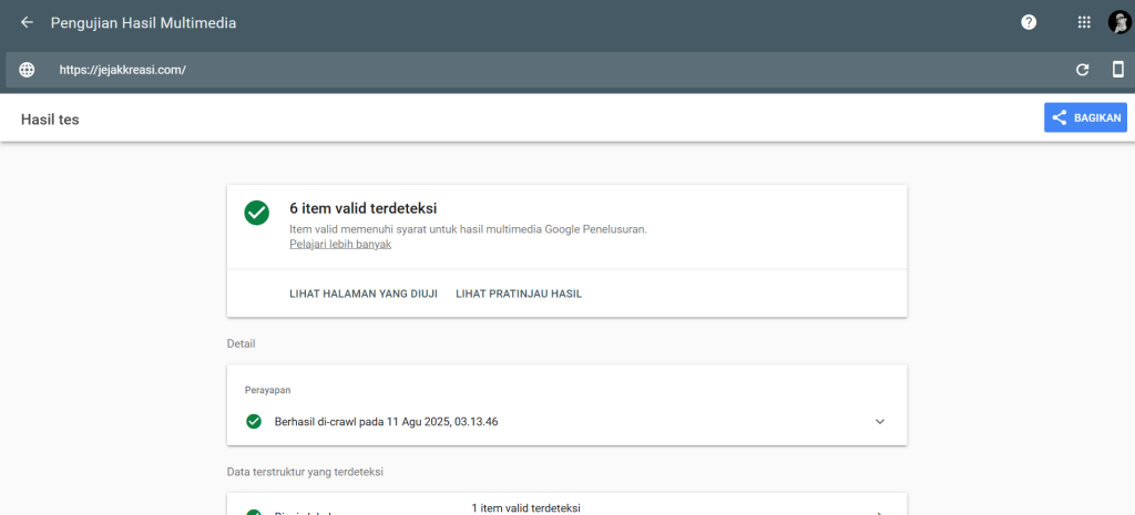 - Warning → ada properti opsional hilang; Google masih bisa menampilkan rich result, tetapi fitur tertentu mungkin tidak lengkap.