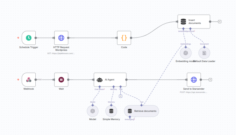 - Data jawaban diambil dari wordpress (artikel β diproses jadi embeddings β disimpan di vector store).