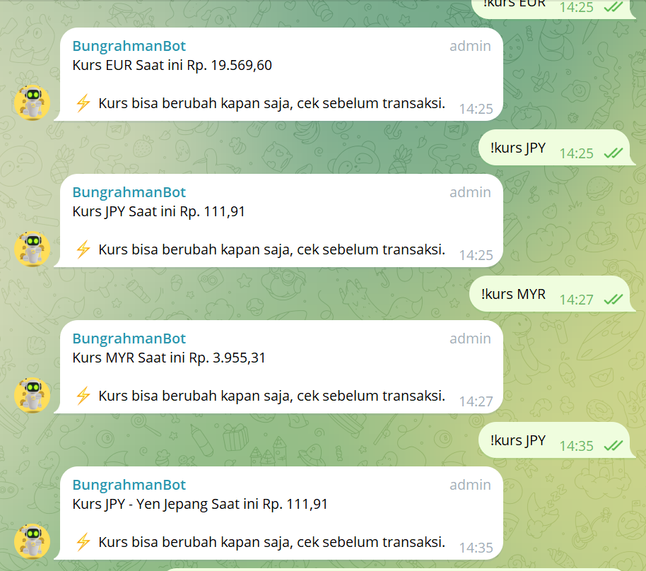 Bot Telegram otomatis membalas kurs mata uang ke Rupiah saat ada anggota grup mengetik !kurs <kode_mata_uang>. Jika kode mata uang salah, bot akan memberi pesan error.